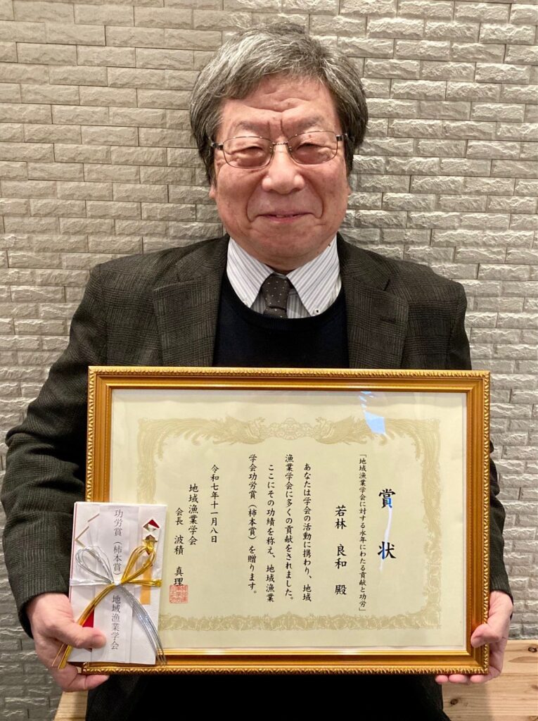 令和7年11月8日(土)に熊本学園大学1号館で開催された「地域漁業学会第67回大会」において、南予水産研究センター顧問の若林良和特命教授は、地域漁業学会での永年にわたる貢献と功労に対して、「第66期(2025年度) 地域漁業学会功労賞(柿本賞)」を授与されました。