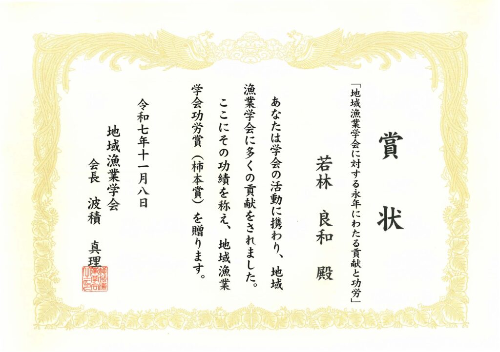 本賞は、「当該分野において多年にわたり活動や研究を行い、地域漁業の発展に対し多大に貢献したと認められるもの」で、「当学会創設に尽力された名誉会員柿本典昭氏の名を冠するもの」です。(地域漁業学会会則、学会賞選考規程)若林特命教授は、地域漁業学会における多面的な研究活動、地域漁業学会の活性化に向けた組織改革や管理運営への多大な貢献などが評価されて、今回の受賞に至りました。