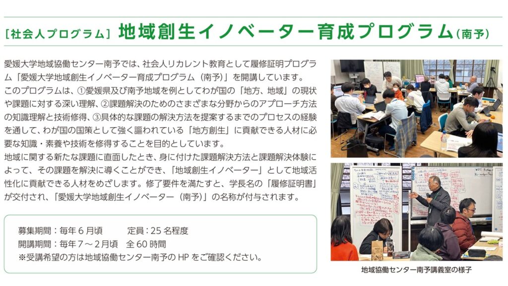 愛媛大学地域協働センター南予では、社会人リカレント教育として履修証明プログラム「令和8年度愛媛大学地域創生イノベーター育成プログラム(南予)」を開講します。(期間7月25日~1月9日、定員25名、履修証明コースは全60時間・プログラムデザインコースは全36時間)