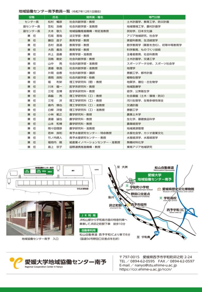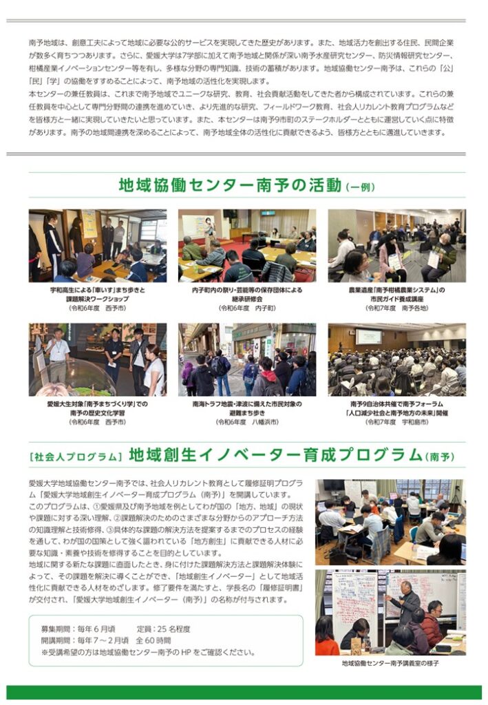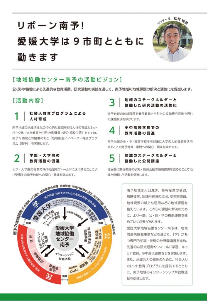 愛媛大学地域協働センター南予では、センターでの教育、研究、社会貢献活動等をとりまとめたパンフレットを作成しました。コチラからPDFファイルをダウンロード可能です。ぜひご覧ください。