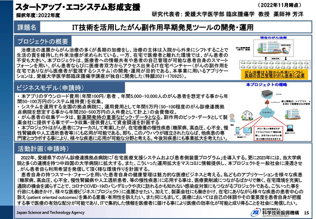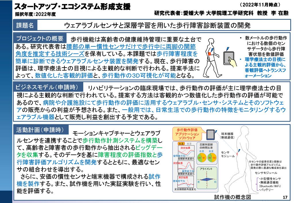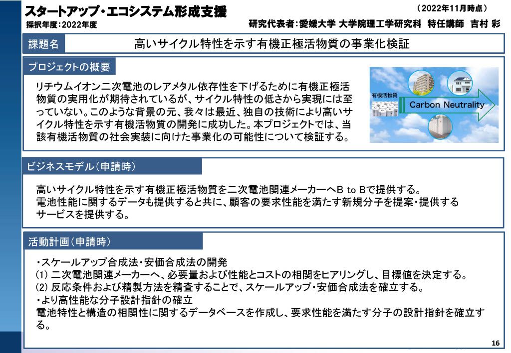 大学発スタートアップ創出を目的とした資金支援制度です。支援後の起業を目指し、研究成果を事業化するためのPoC、試作、ビジネスモデル構築、事業化開発などに活用できます。