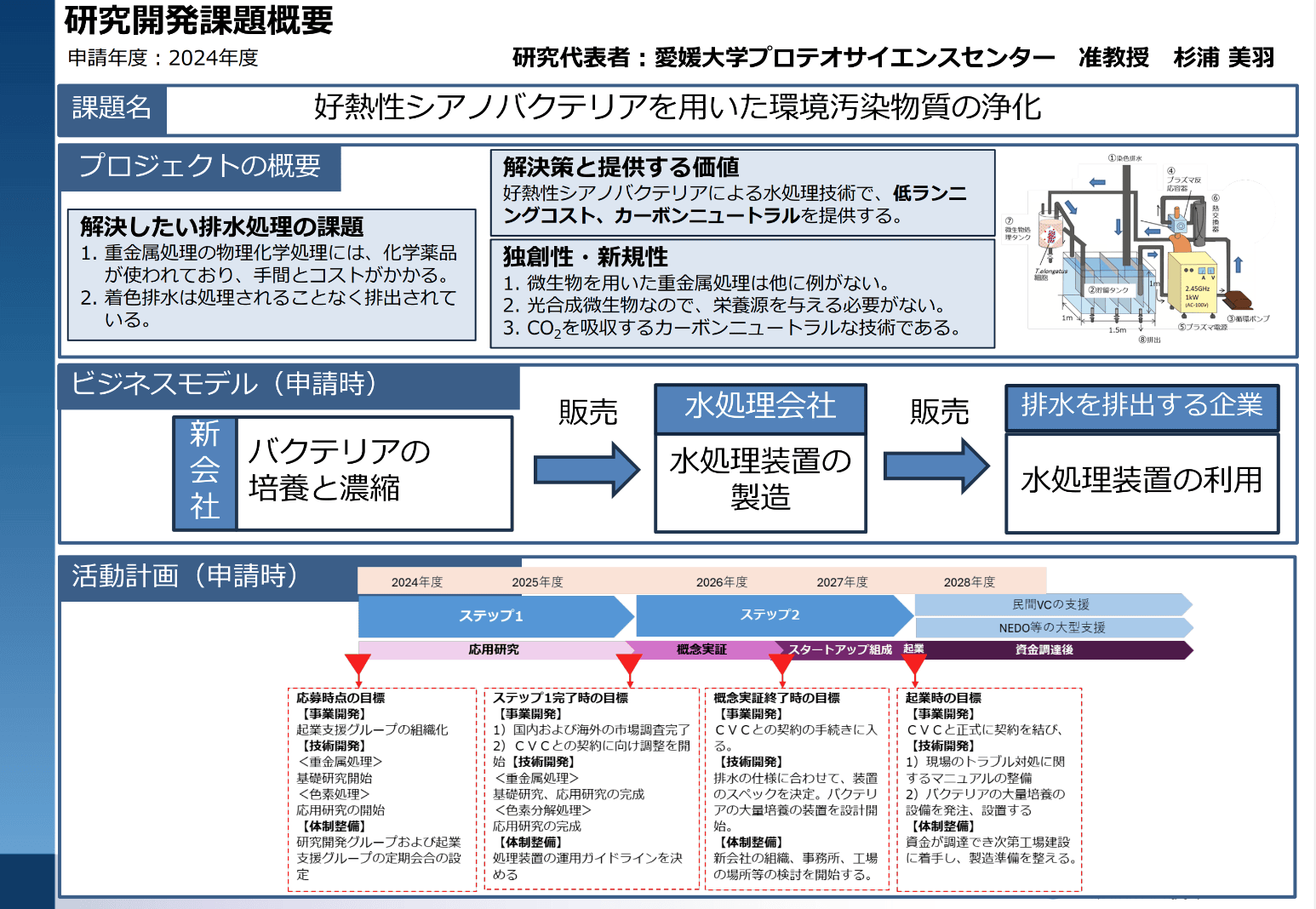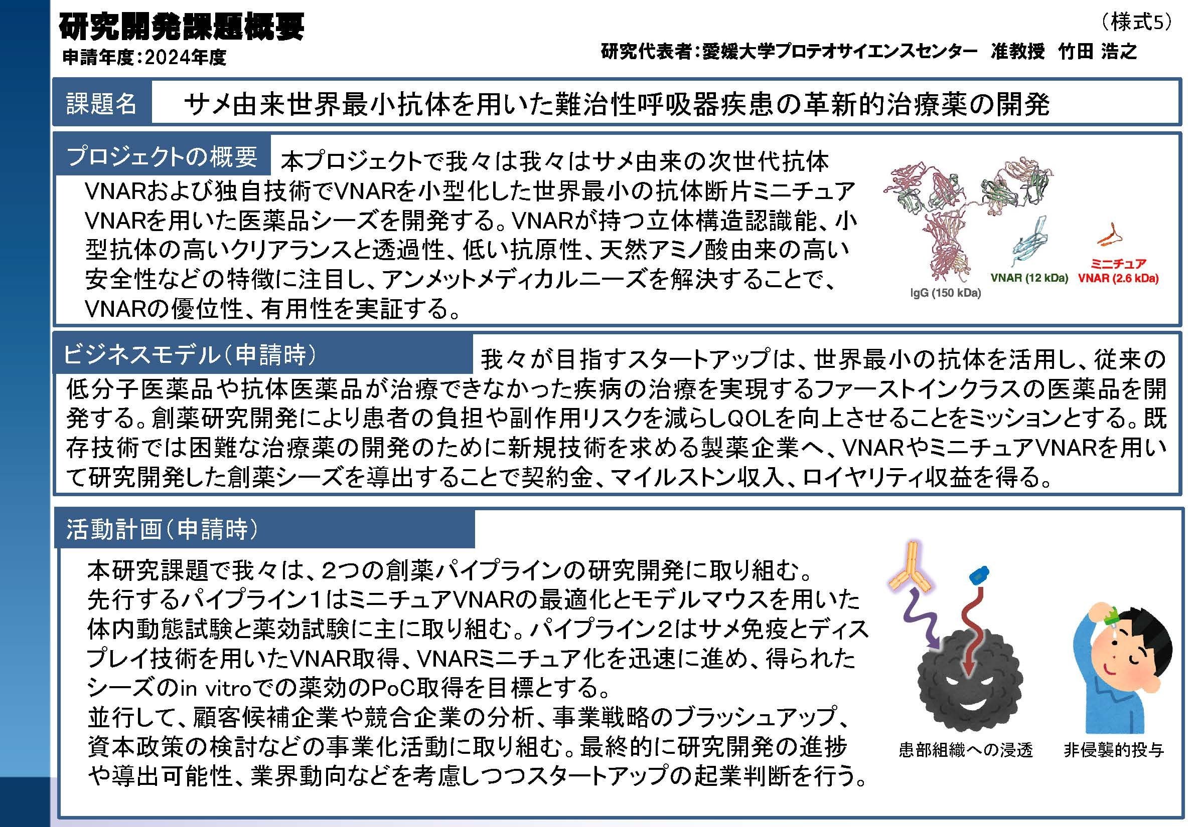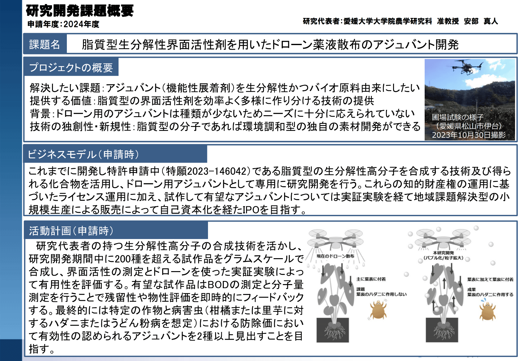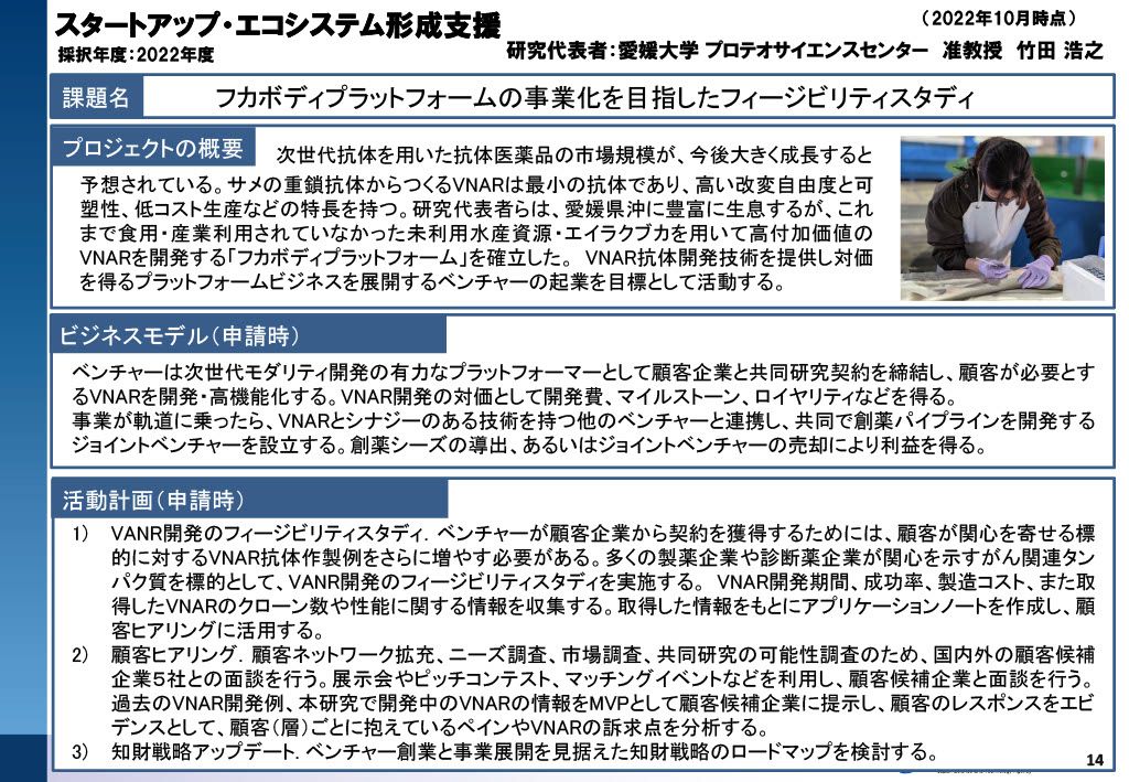 愛媛大学の研究者であること、起業意思があることが必須です。修士・博士課程の学生も応募可能ですが、学部生は不可です。