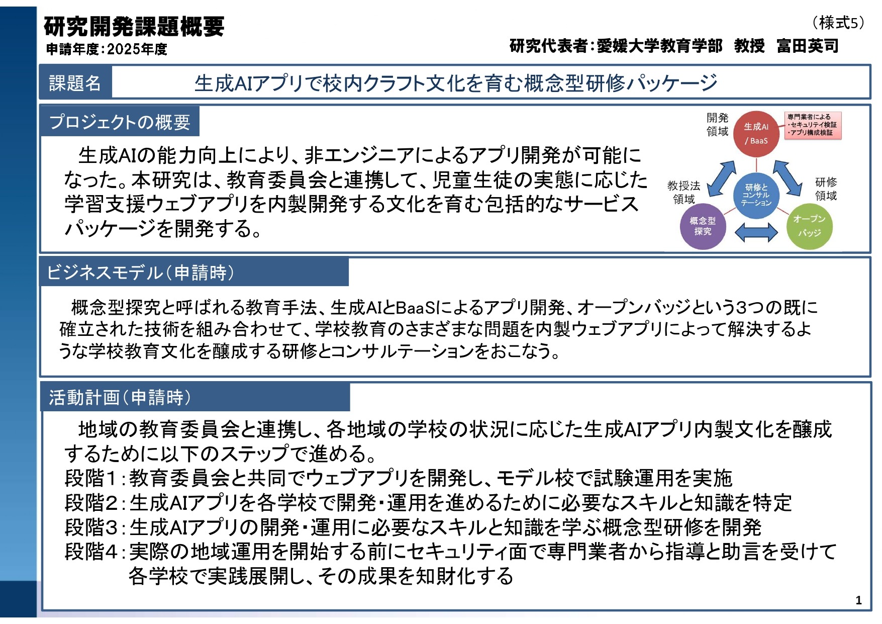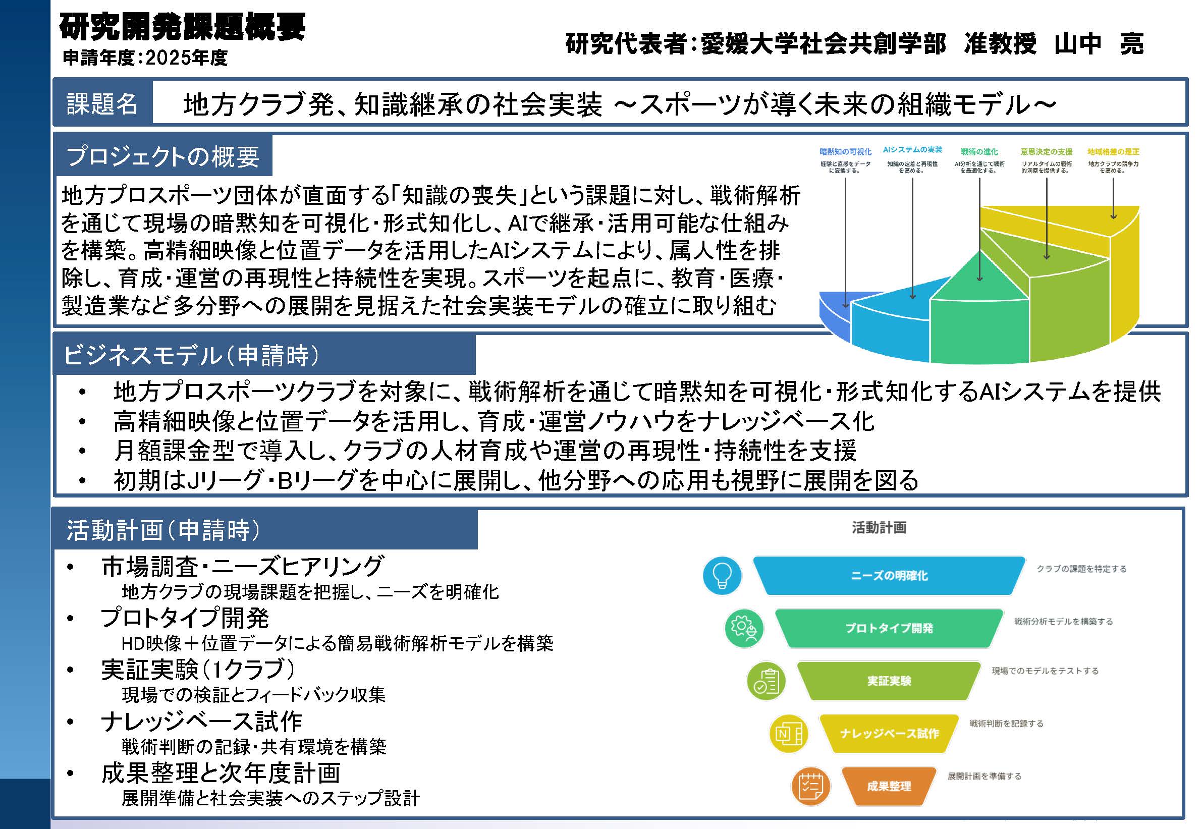本プログラムは、愛媛大学の研究者・学生が生み出した研究成果や技術シーズを、社会に届けるための「出口づくり」を支援する取組です。研究活動の成果を、論文などの学術的な発信に加えて、社会での活用という観点からも捉え直し、