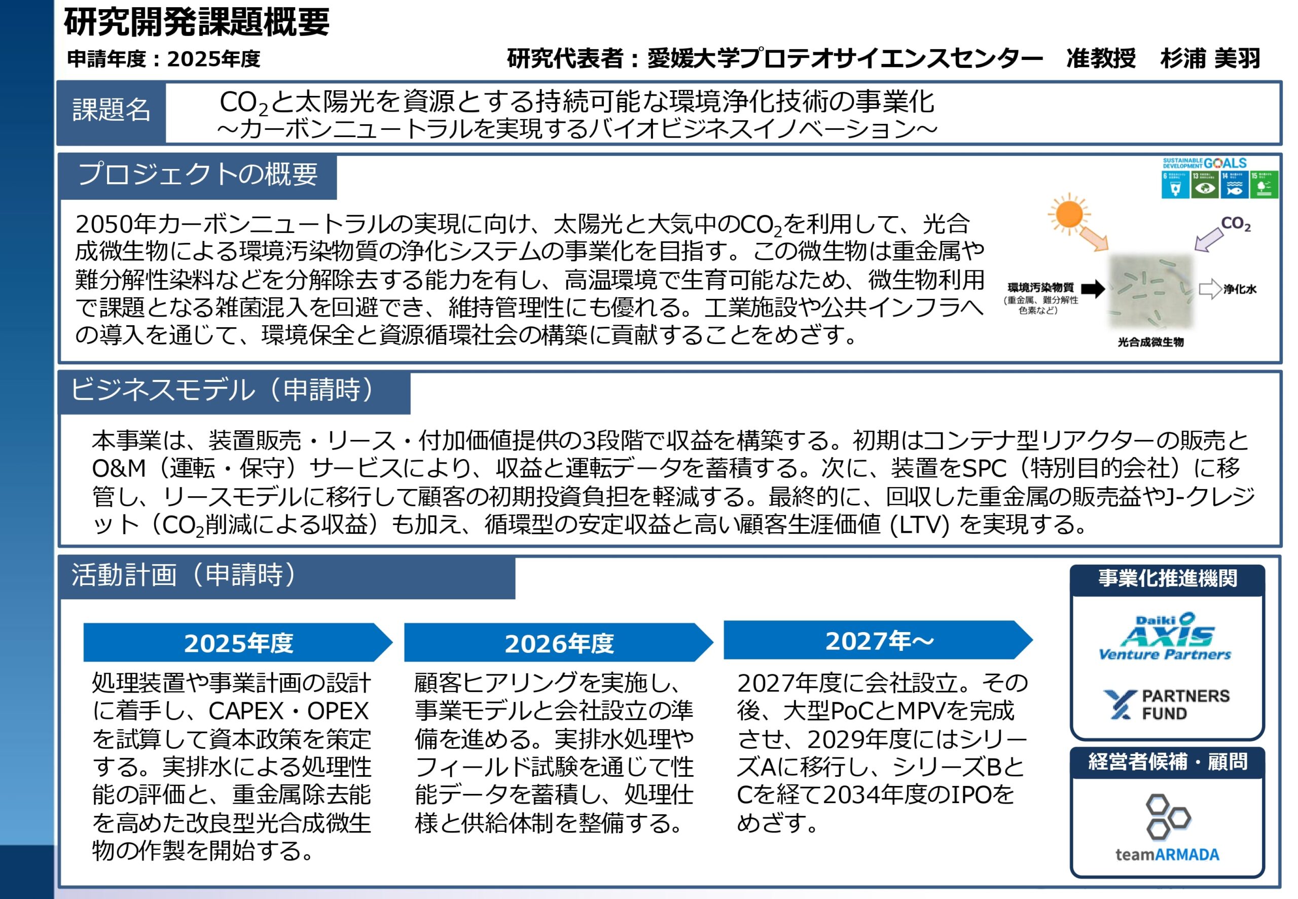 大学の革新的技術シーズを基にグローバル市場を目指す大学等発ベンチャーや、SDGsの達成、地域の社会課題解決にも資する社会的インパクトの高い大学等発ベンチャーの創出を目的としており、大学の技術シーズの発掘、研究開発課題の募集・選考を行います。