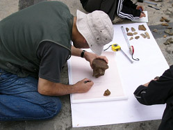 | 製鉄の際の残滓(スラグ,鉄滓)を観察。 | 鉄滓は工程ごとに異なる。分類作業中。 |